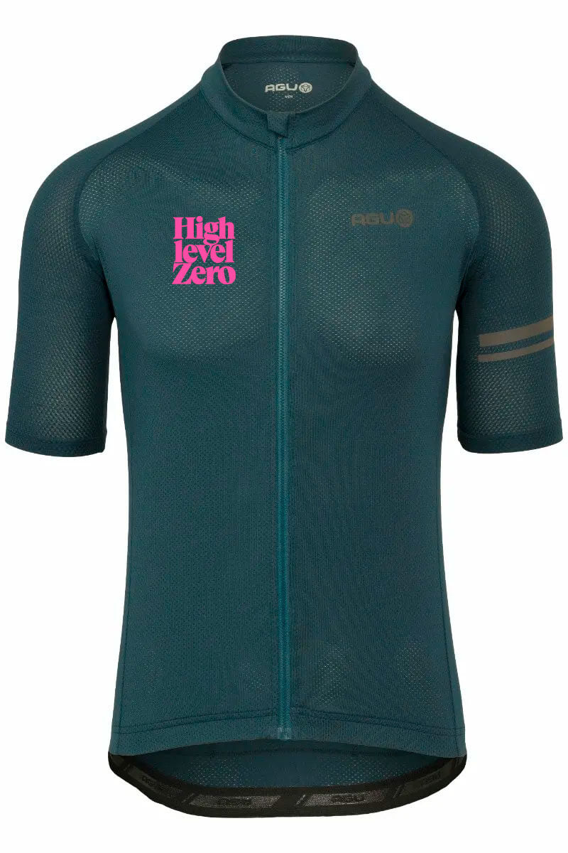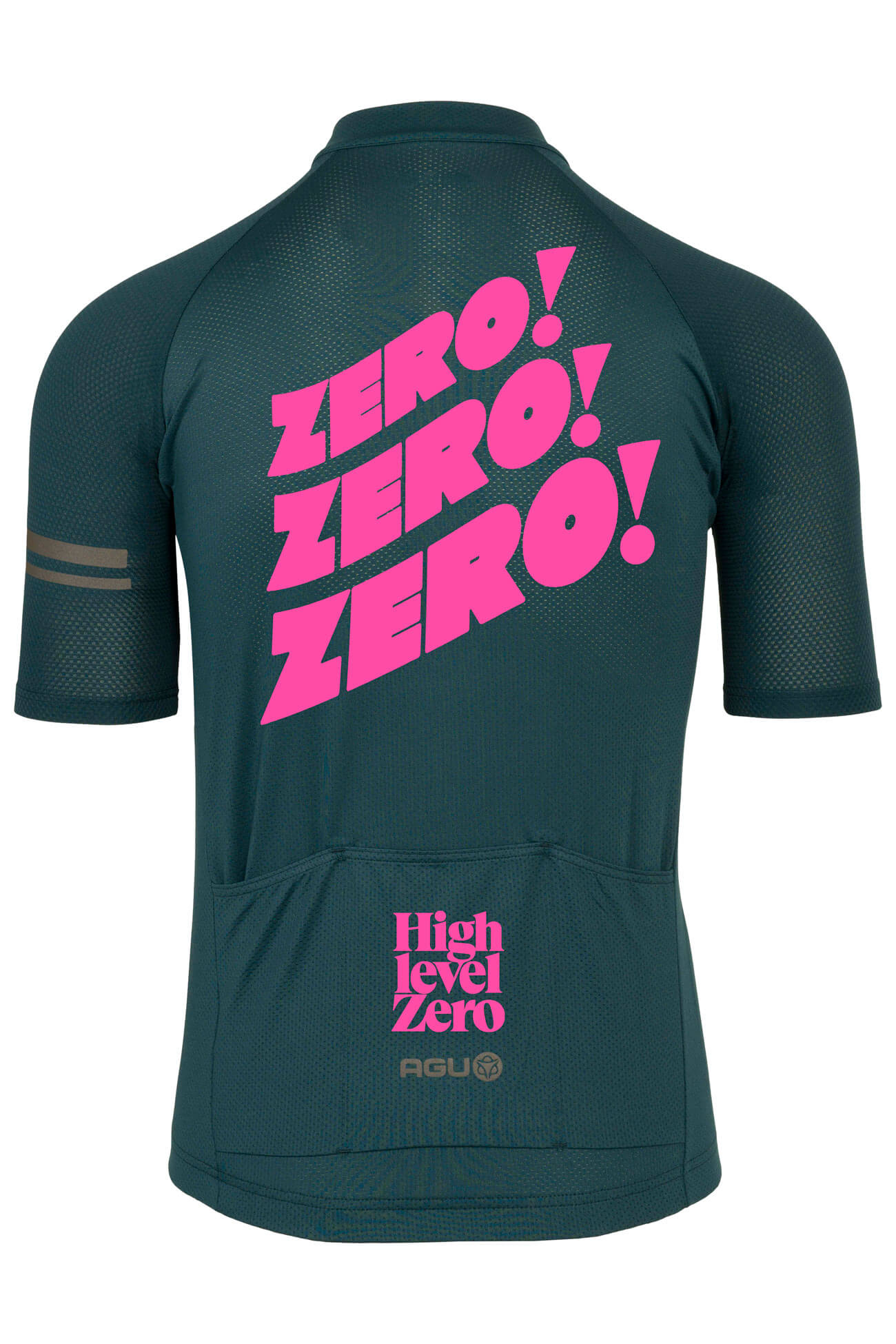 Das atmungsaktive Trikot in tiefem Grün ist ein hochwertiges Modell aus der offiziellen AGU-Kollektion – von uns per DTF-Verfahren mit neon leuchtendem „ZERO! ZERO! ZERO!“-Print und Highlevel Zero Logo veredelt.